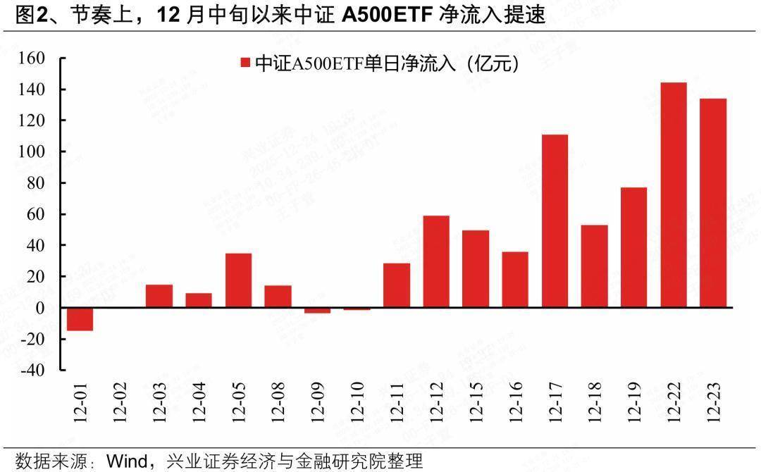 智通财经APP获悉,兴业证券发布研报称,12月以来,精深投资者通过申购中证A500ETF布局A股,成为近期市集主要的增量资金之一。截止12月23日,A500ETF净流入规模总共达745亿元,日均净流入近50亿元。节拍上,12月中旬以来A500ETF净流入明显提速,与本钱市集树立共振。